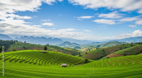 Lush green rice terraces cascade down hills under blue skies