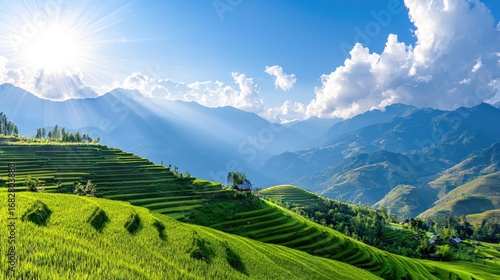 landscape, rice, terrace, green, nature, agriculture, sunlight, mountain, sky, cloud, blue, scenic, environment, rural, calmness, hill, field, vibrant, sunny, harvest, cultivation, beauty, travel, scenery, peaceful, vale, earth, growth, water, panoramic, lush, fresh, picturesque, serenity, vista, natural, countryside, farming, terrain, seasonal, summer, wildlife, greenery