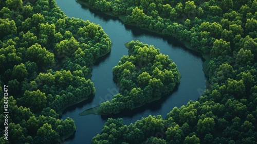 Lush green river winding through dense forest at sunrise showcasing nature's untouched beauty and tranquility