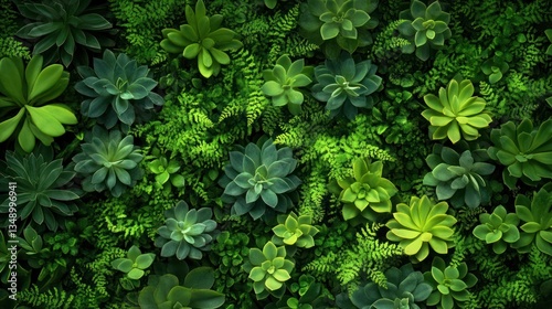 Lush green succulent and fern wall, indoor garden backdrop, botanical texture