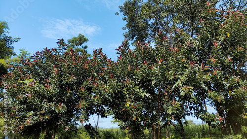 tree, green, foliage, leaf, red, new, growth, vibrant, lush, nature, environment, sky, blue, clear, sunny, bright, fresh, plant, healthy, botanical, garden, park, natural, beauty, texture, pattern, organic, summer, spring, light, serene, peaceful, tranquil, beautiful, air, ecology, life, detail, unique, colourful