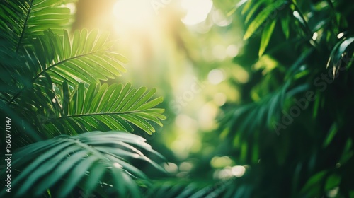 Lush Green Tropical Foliage Bathed in Golden Sunlight: A Serene Nature Escape