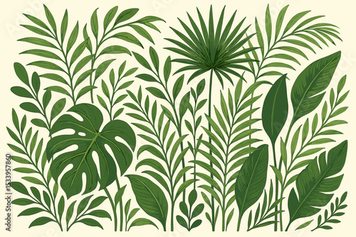 Lush green tropical leaves collection. Vector illustration of jungle foliage with monstera, fan palm, banana leaf. Exotic botanical background for summer design, print, wallpaper.