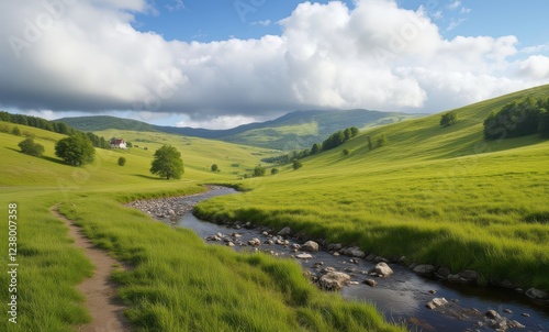 landscape, nature, countryside, blue skies, cloud, hill, serene, tranquil, rural, outdoors, scenic, stream, grass, mountain, environment, idylli, summer, meadow, water, picturesque, climate, hiking, travel, photo, eco, flora, sunlight, greenery, wildlife, peaceful, field, scenic view, natural beauty, fresh air, nature trail, landform, recreation, exploration, serenity, horizon, lush