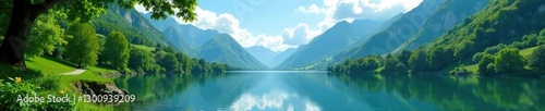 Lush greenery around a peaceful lake in the mountains, lush greenery, mountains, serene water