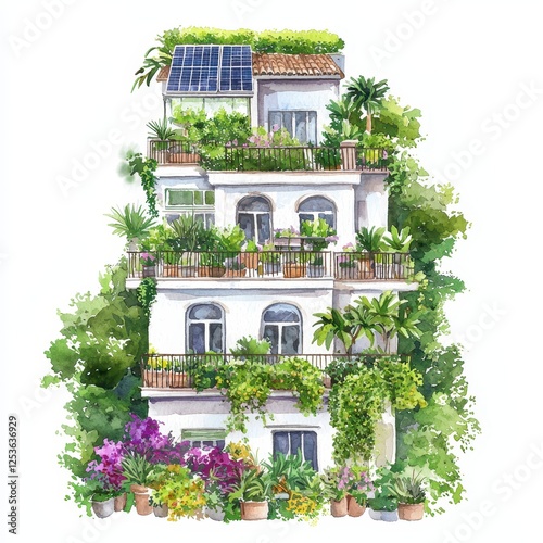 apartment, building, greenery, watercolor, lush, plant, solar, balcony, garden, flower, house, home, architecture, residential, urban, nature, sustainable, green, rooftop, mediterranean, painting, illustration, design, property