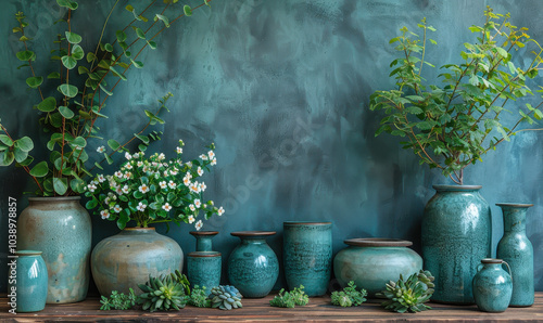 Lush Greenery in Ceramic Pots Against Green Grey Backdrop - Botanical Flatlay with Succulents, Flowering Plants, and Foliage for Home Decor and Gardening Inspiration