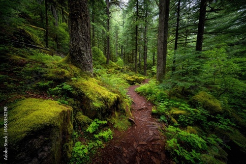 forest, path, trail, moss, lush, green, tree, nature, wood, hiking, pathway, sunlight, shadow, dark, damp, moist, plant, vegetation, emerald, growth, scenic, tranquil, calm, serenity, adventure, exploration, journey, walk, root, rock, scenery