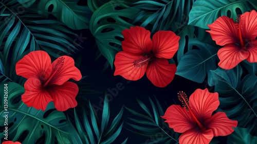 Lush Red Hibiscus Blooms on Dark Tropical Foliage,Floral ,Wallpaper