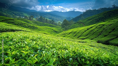 Lush tea plantation valley, vibrant green hills, dramatic sky, picturesque landscape