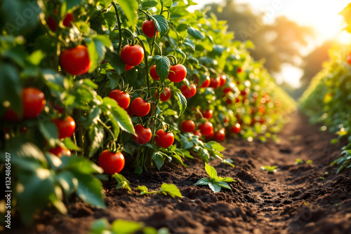 Lush Tomato Field with Vibrant Red Tomatoes Growing on Green Vines – High-Quality Stock Image for Farming, Gardening, and Agricultural Editorial Use