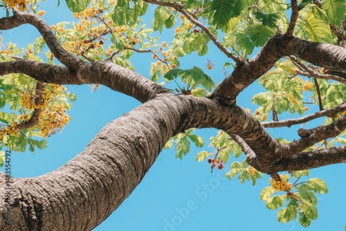 tree, branch, leaf, sky, aglow, nature, green, yellow, flower, fruit, bark, texture, growth, daylight, sunlight, flora, foliage, tropical, vibrant, strong, organic, beautiful, lush, upward, view, closeup, detail, brown, grey, light, dark, natural, fresh, colours, bright