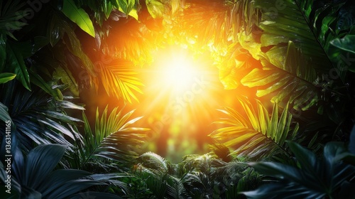 Lush Tropical Foliage Frame with Radiant Sunlight Bursting Through Dense Green Canopy in Exotic Jungle