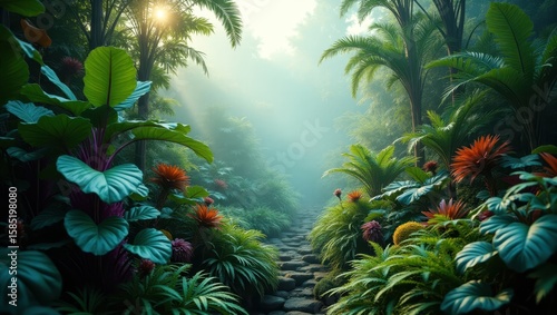 Lush tropical foliage pathway through a misty jungle.