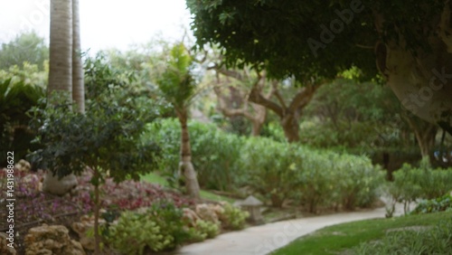 Lush tropical garden with defocused greenery and pathway in luxury resort featuring serene ambiance and vibrant plant life, perfect for relaxation and wanderlust.