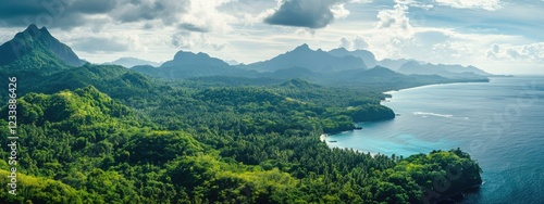 tropical, landscape, aerial, view, mountain, greenery, coastline, sea, blue, sky, cloud, lush, abundant, calm, nature, environment, scenic, travel, paradise, exotic, outdoors, vegetation, water, horizon, sky, wild, peaceful, summer, pattern, geography, topography, natural, beauty, vacation, adventure, serene, panorama, freshness, biodiversity, relaxation, calmness, tropics, coast, fauna, flora