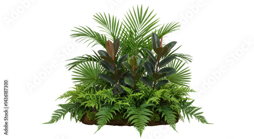 Lush tropical medley of fan palms rubber plants ferns against stark black backdrop