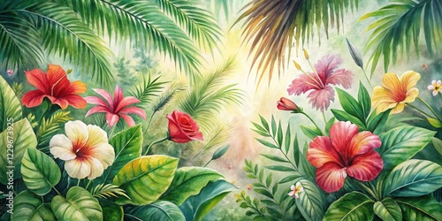 Lush Tropical Paradise A vibrant watercolor painting of hibiscus blossoms, roses, and other exotic flowers flourishing amidst vibrant green foliage, bathed in soft sunlight.
