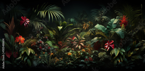 Lush tropical rainforest wall with vibrant green leaves and exotic plants creating a dense and natural jungle-like environment