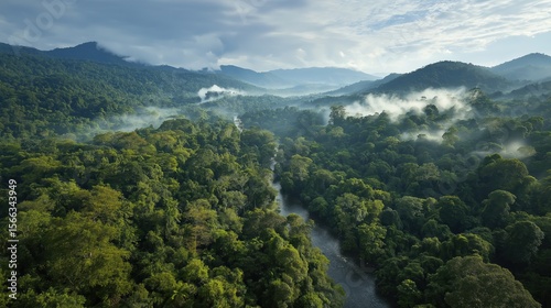 Lush Tropical Rainforest with Misty River and Mountain Range at Sunrise