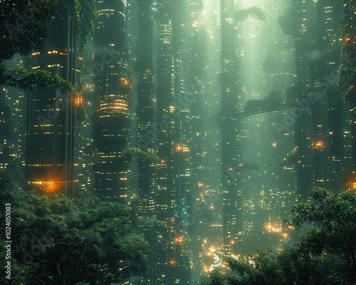 forest, skyscraper, city, light, nature, green, technology, urban, fantasy, skyline, tree, illumination, architecture, calmness, mist, dream, futuristic, serenity, beauty, environment, glow, landscape, oasis, atmosphere, environmentally friendly, adventure, exploration, shadow, contrast, growth, harmony, foliage, wilderness, giant, peaceful, day, vibrant, structure, scene, surreal, discovery, depth, imaginative