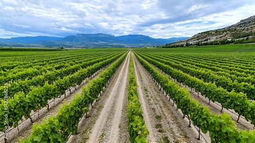 Lush Vineyard Rows Under Dramatic Sky in Scenic Landscape