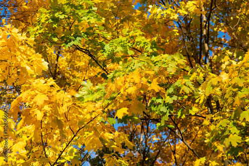 autumn, leaf, tree, october, red, yellow, nature, forest, gold, sunlight, bright, background, plant, season, lush, foliage, maple, fall, outdoors, environment, beauty, orange, tree branch, park, colours, vibrant, abstract, light, sun, design, sky, horizontal, no people, photo, color image, blue, orange color, maple, green