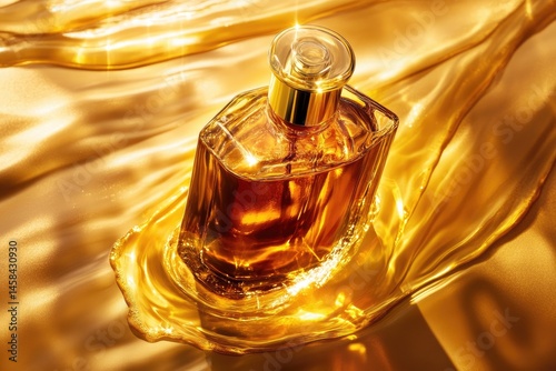 Luxurious amber perfume bottle resting on a golden liquid backdrop