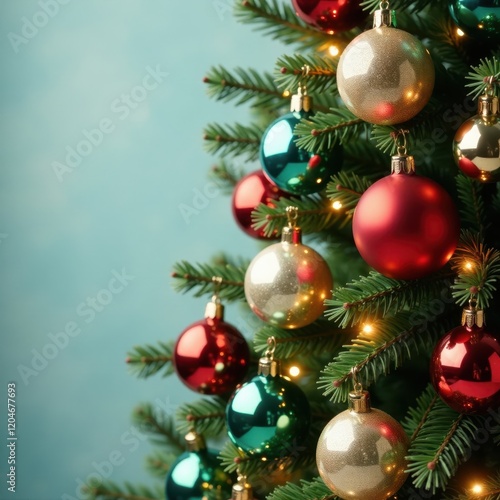 Luxurious Christmas tree with large glass balls and metallic tinsel, glass, metallic, tinsel