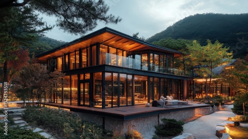 architecture, building, house, home, exterior, design, modern, glasses, wooden, structure, residential, contemporary, luxury, estate, evening, twilight, landscape, garden, tree, foliage, plant, greenery, mountain, sky, cloud, view, illumination, lighting, comfort, elegant, facades, terrace, deck, stone, step, pathway, seating, sofa, minimalist, construction, scenic, peaceful, natural, serene, roomy, outdoors