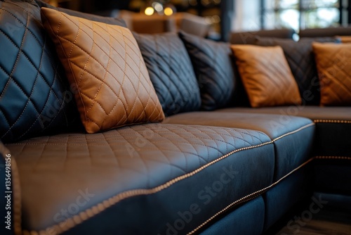 sofa, sectional, leather, cushion, pillow, dark, tan, corner, modern, furniture, design, living, room, home, decor, interior, luxury, comfortable, seating, elegant, style, accent, detail, stitching, stitched, quilted, fabric, pattern, dark brown, high-end, quality, hand-made, hard-wearing, stylish, upholster, home decor, living space, interior design, cosy, relaxing