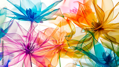 Luxurious elegant background with transparent multi-colored flowers in yellow, blue and pink. Banner for decoration, print, invitations, design.