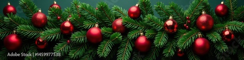 Luxurious evergreen garland draped with vibrant red & gold ornaments , holiday greenery, winter spirit