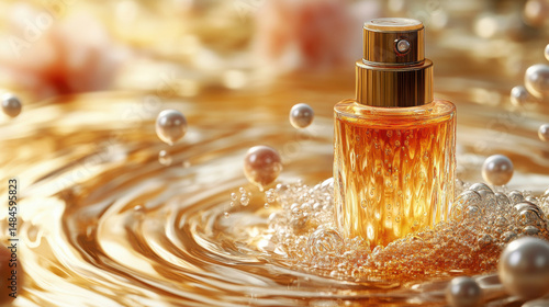 Luxurious golden perfume bottle emerges from a captivating swirl of liquid, adorned with shiny pearls, creating an atmosphere of sophistication and indulgence.