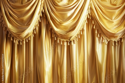 Luxurious golden silk curtains are elegantly draped and adorned with tassels, creating a rich and opulent atmosphere
