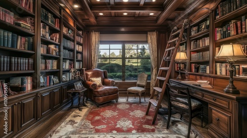 library, bookshelf, book, wooden, leather, armchair, desk, window, garden, home, interior, room, house, study, reading, cognition, education, luxury, elegant, classic, traditional, comfortable, peaceful, quiet, tranquil, relaxing, cosy, warm, rich, dark, wood, furniture, design, architecture, interior design, home decor, space, view, landscape, nature, carpet, rug, ladder, light, lamp, shelf, literature, wisdom, learning