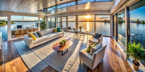 Luxurious Houseboat Interior Design: Drone View of Modern Floating Home