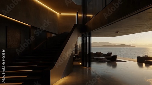 Luxurious modern interior with a staircase and ocean view. Soft lighting creates a sophisticated ambiance