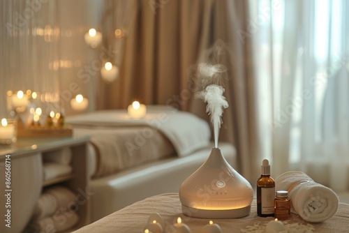 Luxurious Spa Room with Essential Oils and Diffuser for Relaxation and Aromatherapy Ambiance