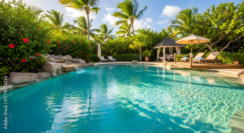 pool, swimming, water, blue, tropical, resort, luxury, vacation, garden, nature, green, palm, tree, foliage, plant, bush, flower, red, waterfall, rock, sun, sky, cloud, bright, clear, serene, tranquil, peaceful, beautiful, idylli, paradise, escape, relaxation, leisure, summer, warm, day, light, reflections, ripple, surface, edge, deck, patio, lounge, chair, umbrella, gazebo