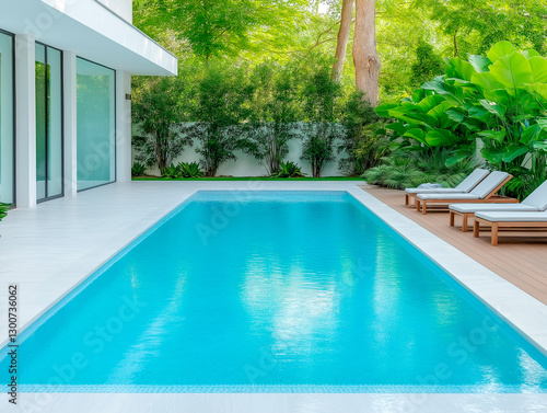 Luxurious villa with a private pool surrounded by palm trees and elegant sunbeds. The serene atmosphere, blue water, and modern design create a perfect tropical retreat.