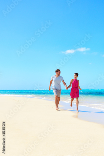 Luxury beach travel vacation couple walking in love during honeymoon getaway on paradise tropical destination. Woman and man running of joy holding hands.