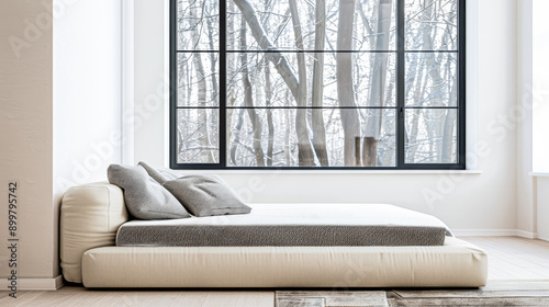 bed, room, minimalist, window, copy space, composition, minimal, furniture, residential, real estate, designer, luxury, contemporary, apartment, pillow, interior design, plain, colours, lighting, serene, bedchamber, comfortable, elegant, relaxation, no people, interior, large, luxurious, home, indoor, cosy, hotel, lamp, stylish, sleep, elegance, estate, relax, simplicity, peaceful, residence, three-dimensional, beige, trendy, inside, art deco