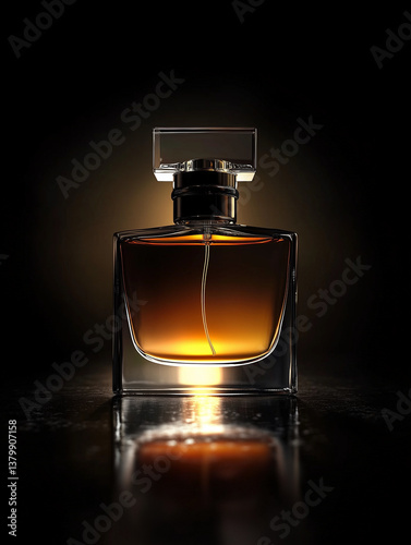 Luxury black perfume bottle on a dark background with golden accents. A minimalist, elegant product shot ideal for beauty branding, high-end advertising, and modern packaging design.