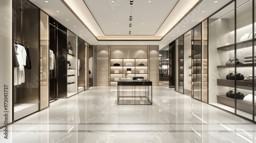 store, interior, design, boutique, luxury, retail, shop, showroom, fashion, minimalism, modern, display, shelf, clothes, rack, lighting, glasses, white, grey, black, metal, floor, tile, ceiling, wall, decor, style, architecture, commercial, elegant, clean, bright, empty, showcase, product, sale, space, contemporary, furniture, structure, arrangement