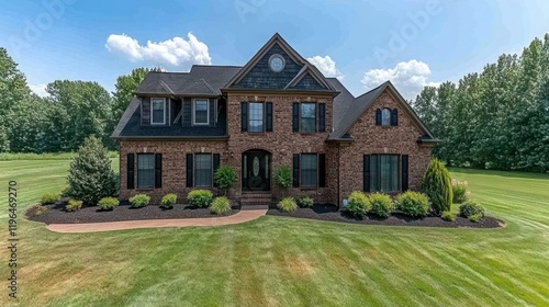 house, home, property, architecture, brick, luxury, suburban, residential, estate, building, dwelling, structure, residence, luxury home, large, roomy, elegant, modern, contemporary, landscaping, garden, grass, yard, tree, sky, cloud, sunny, daytime, exterior, front, view, window, door, roof, brown, black, green, summer