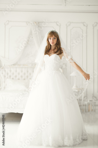 Luxury bride in white dress posing while preparing for the wedding ceremony