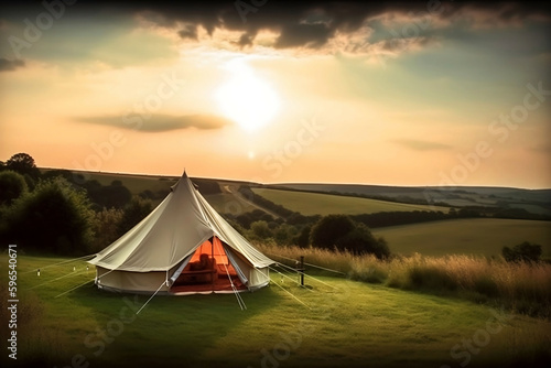 Luxury Camping in Beautiful Nature Landscape with Decoration. Travel and Outdoor Lifestyle Concept. Copy Space