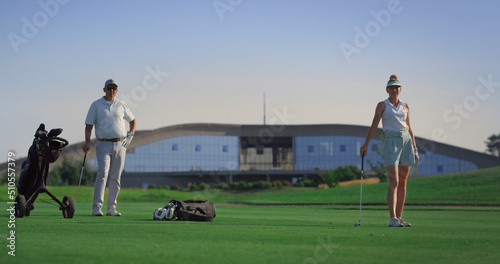 Luxury golfers enjoy play on fairway outdoors. Sport group stand on green course