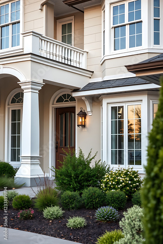 Luxury Home Exterior: Elegant Design and Landscaping. A stunning modern house with beautiful landscaping and architectural details. High-end real estate photography.